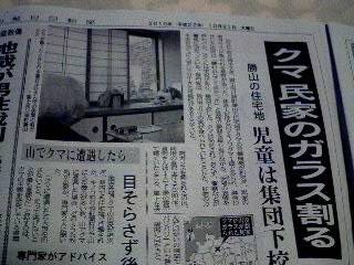 まさか熊が???? 投稿日時: 2010年10月22日 投稿者: admin 返信 私たちが40年以上定宿にしている河口湖畔の富士ビューホテルの従業員の方の生家に熊が出た!と、勝山在住の知人からメールが来た。 とうとう河口湖畔にまで熊が出没するとは、異常事態だ! 知人のメールに添付されていた新聞記事だ。 私たちは来月14日の結婚記念日から6日間、同ホテルに滞在するのだが、ホテルの庭園に熊が出ないことを祈るばかりだ。