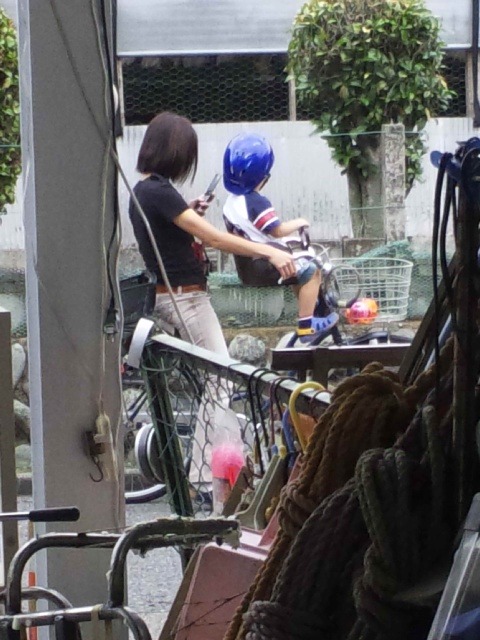 自転車を停め、一緒に乗っている息子があれこれ話しかけたり質問をしているのにそ