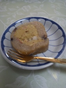 写真のコアの部分にはココナッツに豚ばら肉、ハムなどが練りこまれ、皮の餅の部分には今年は小豆が練りこまれていました。